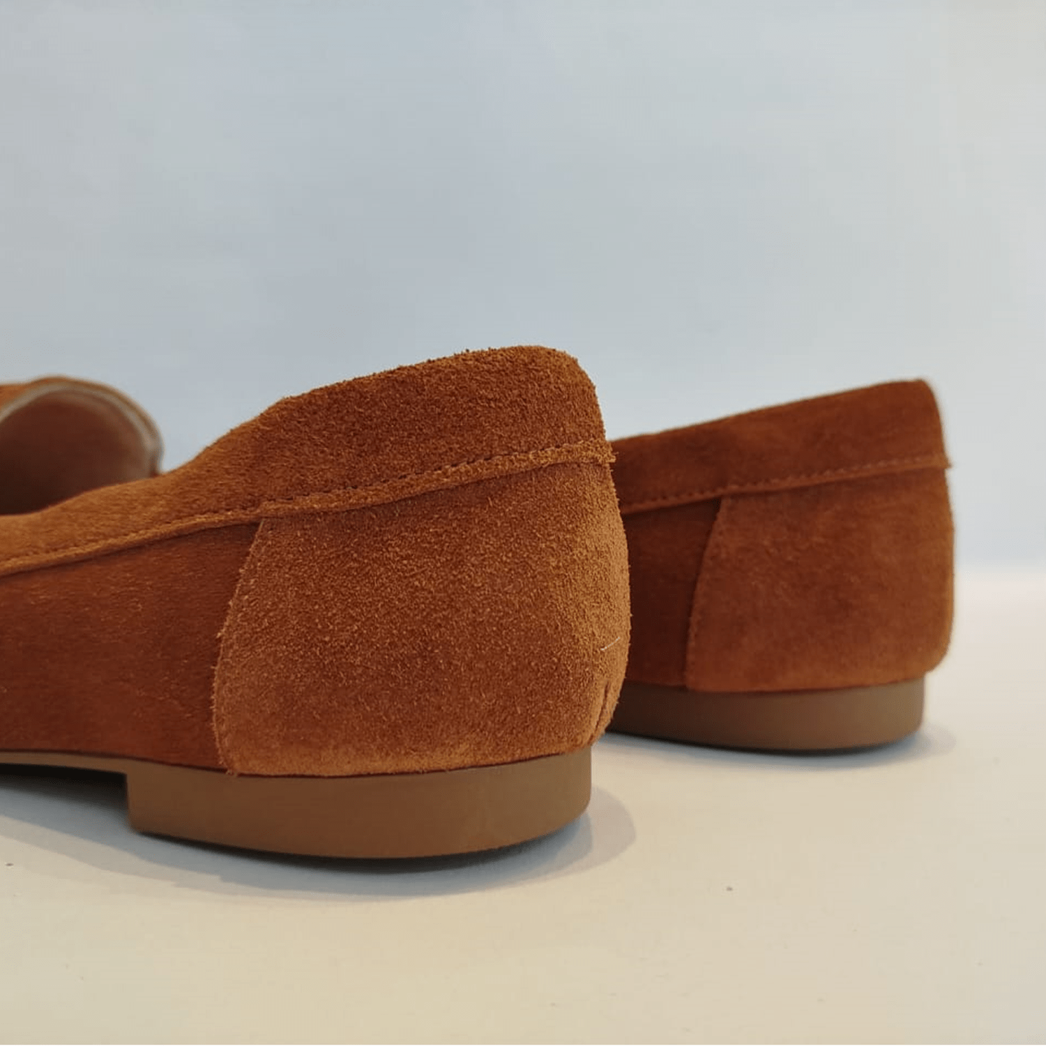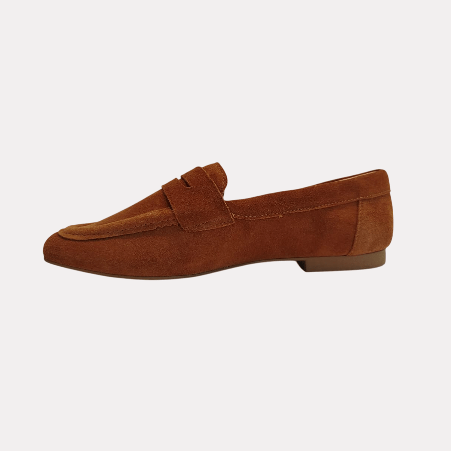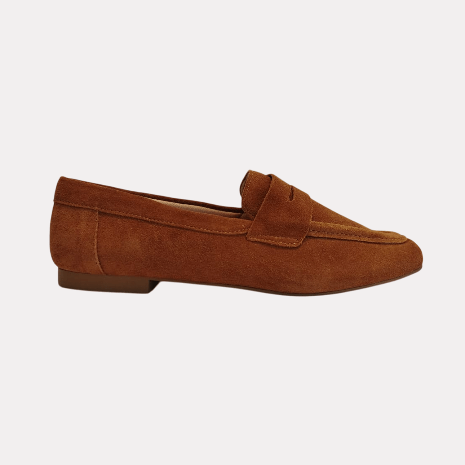 - Detalhes do modelo: Sapato Feminino de camurça estilo mocassim penny loafer. Eles têm um bico elegante em forma de amêndoa e um perfil baixo. A costura é bem visível ao redor da parte superior do sapato, principalmente na ponta, o que adiciona um toque decorativo e estrutural. No geral, este é um sapato casual, clássico e elegante, ideal para um visual confortável e sofisticado.