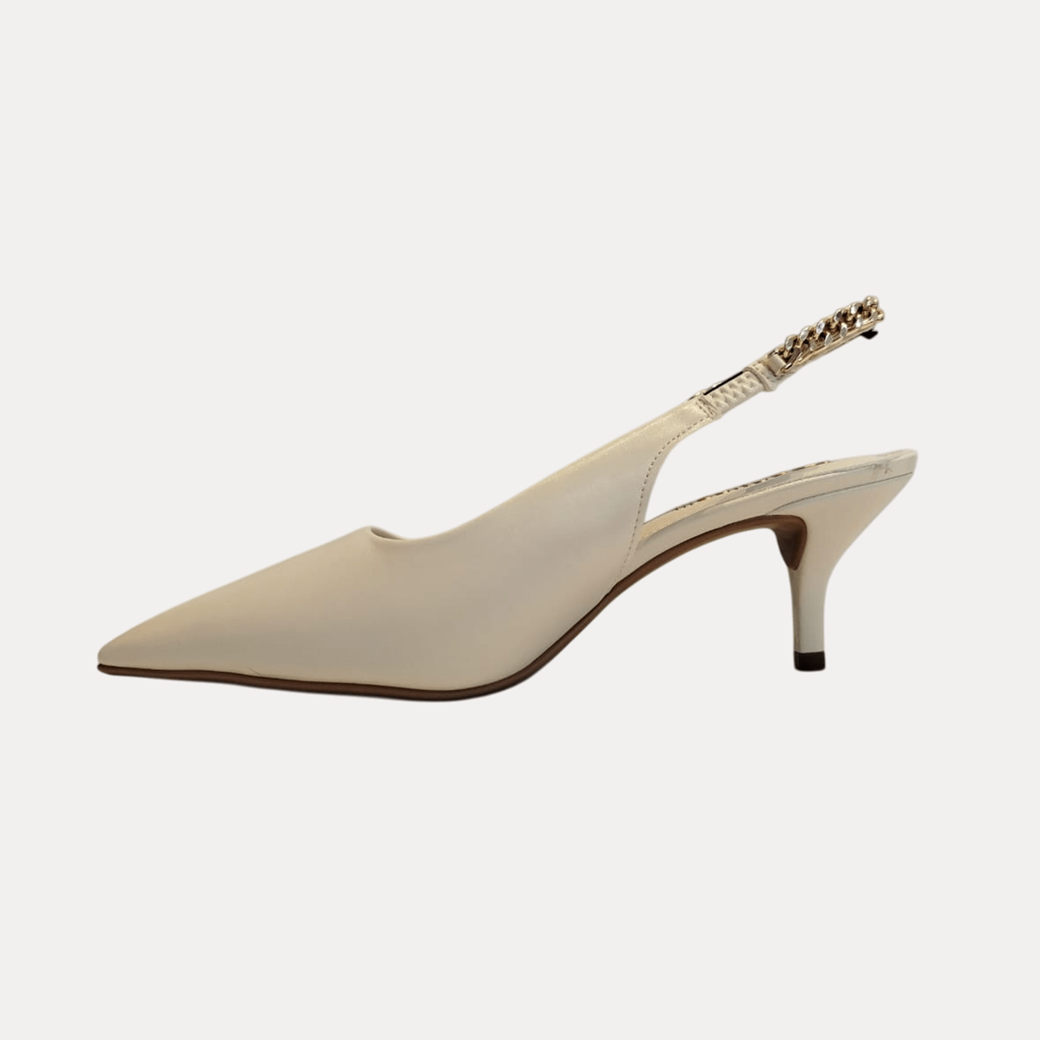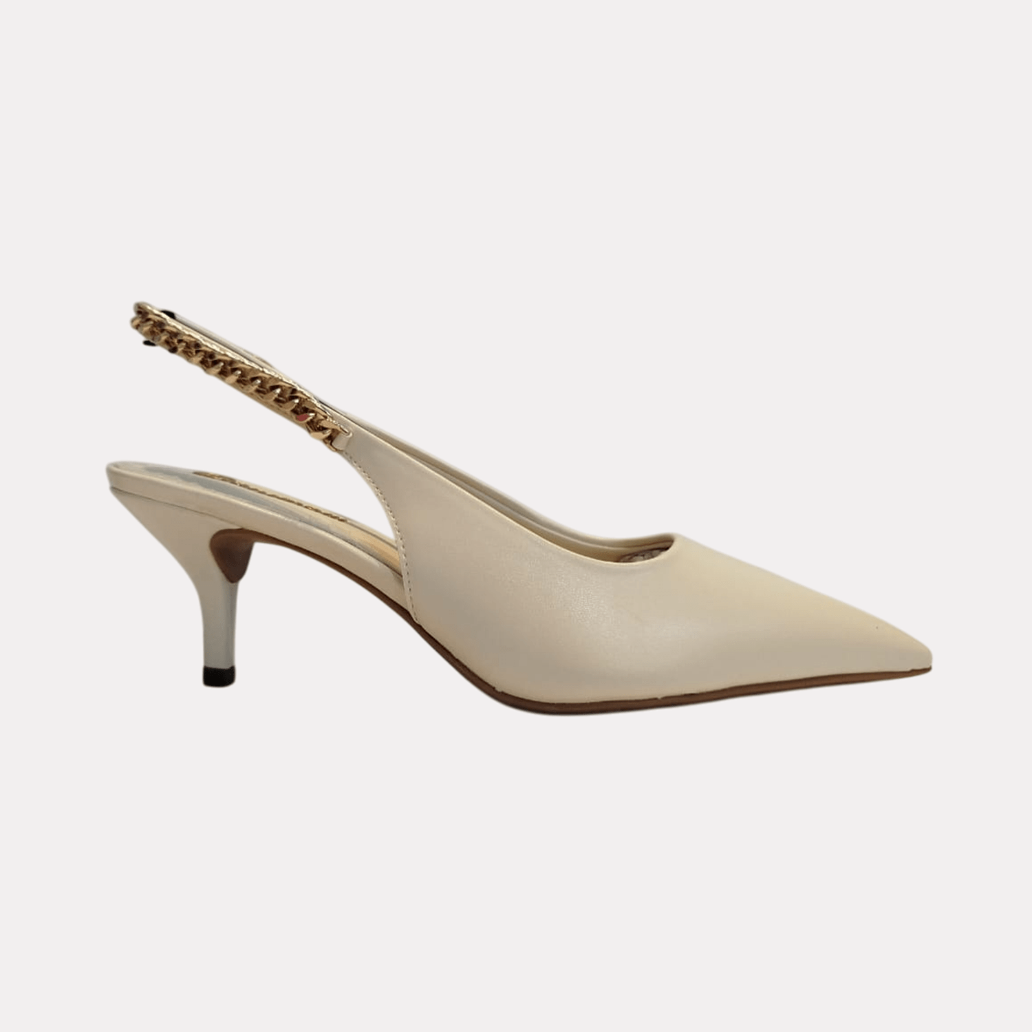 - Detalhes do modelo: Sapato estilo scarpin, bico fino, aberto na parte de trás, com tira e detalhe em elástico e aplicação de correntes.