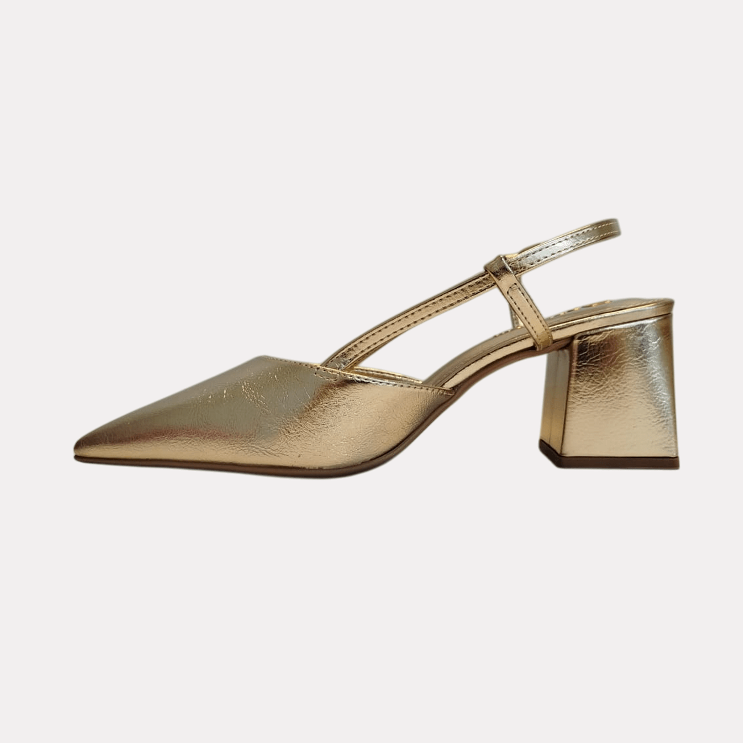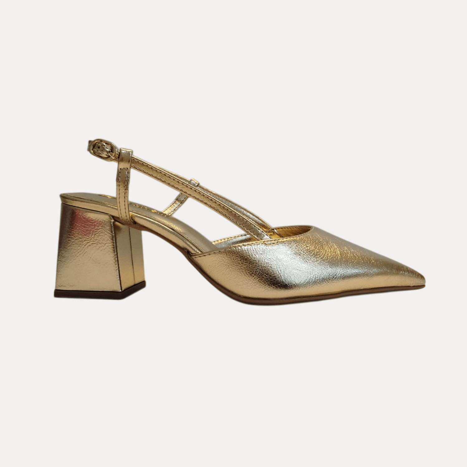 - Detalhes do modelo: Sapato estilo scarpin, bico fino, aberto na parte de trás, com tira e fivela para ajuste e detalhe em elástico.