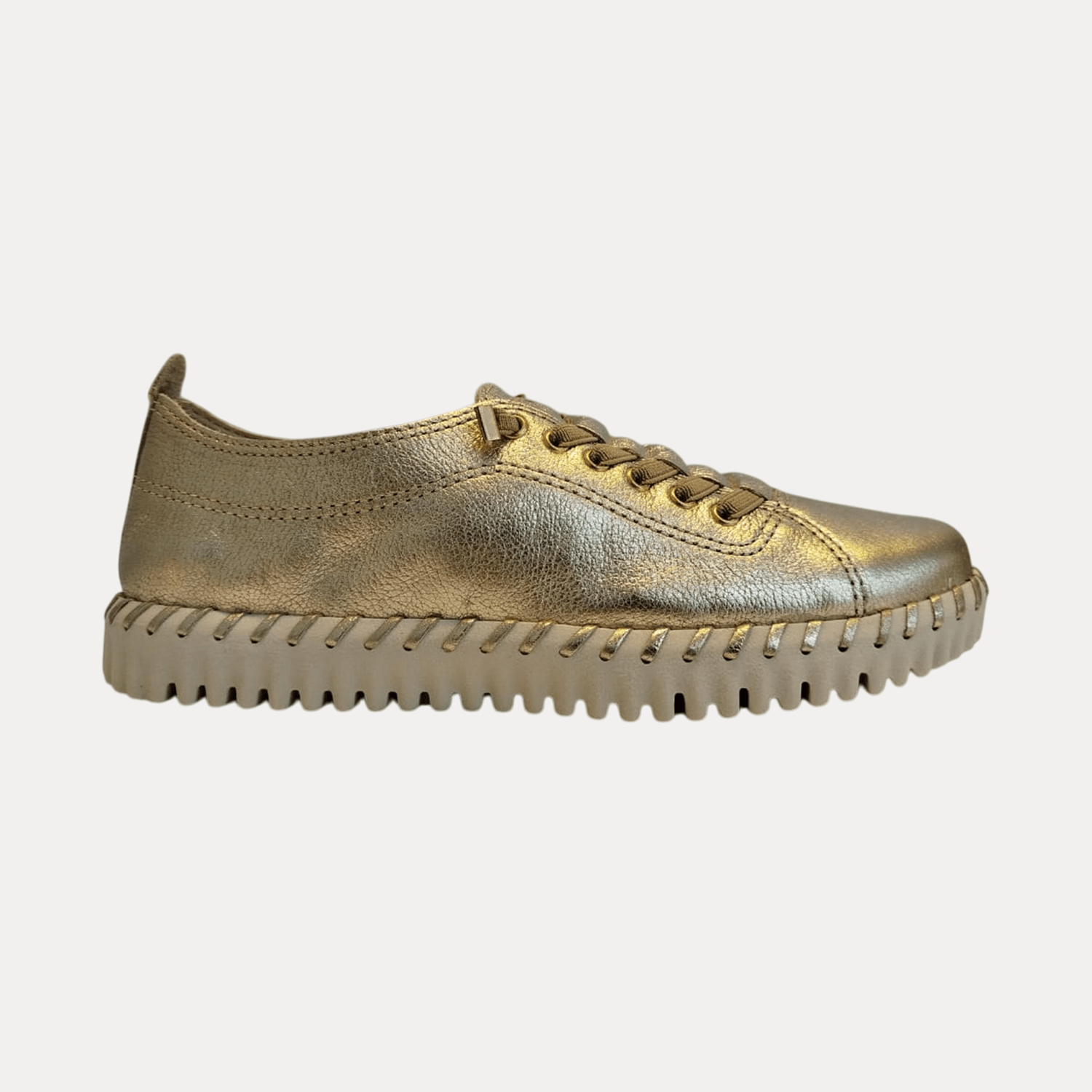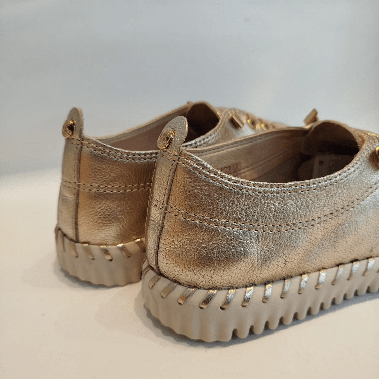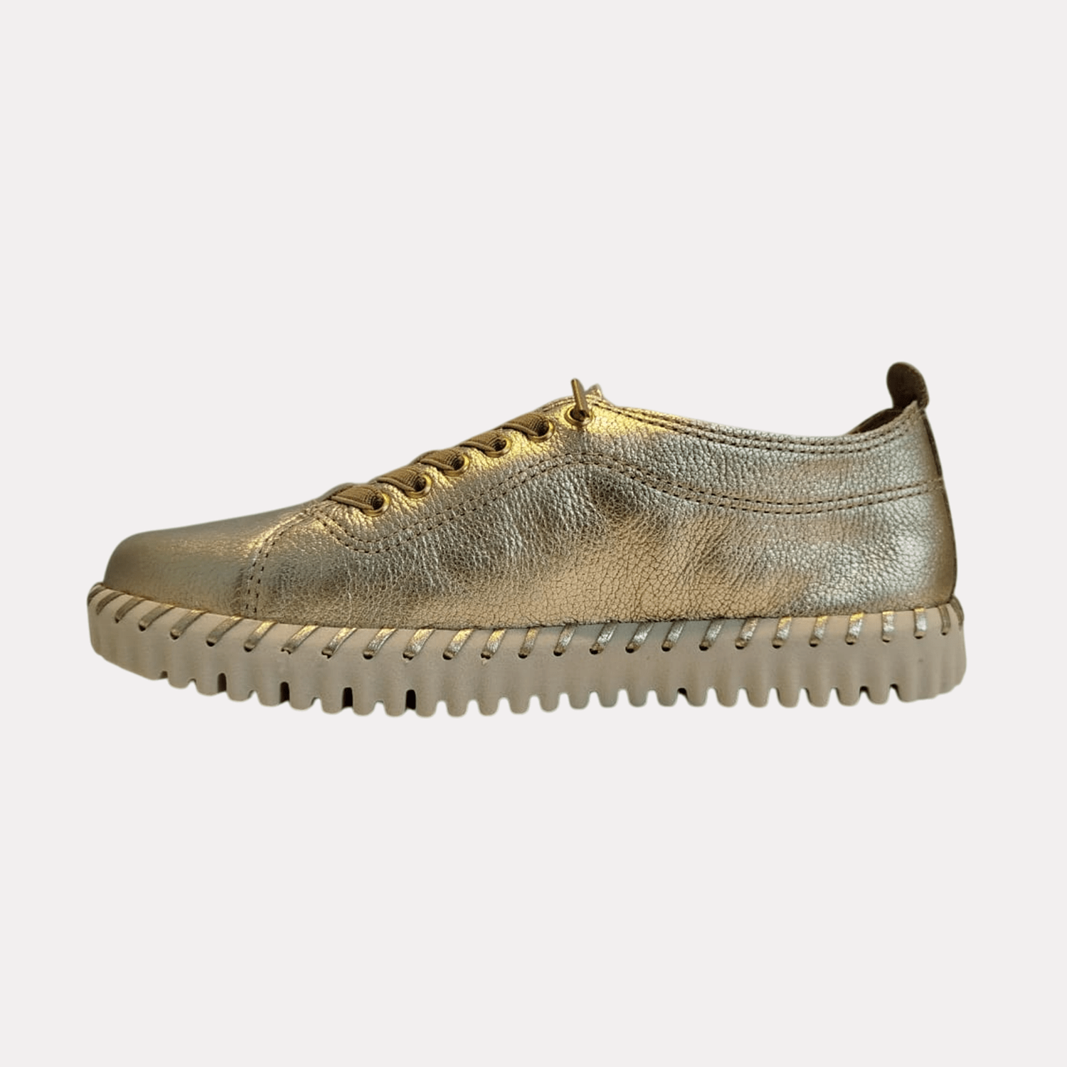 Tênis de couro com bico redondo e ajuste de cadarços de elástico. Com detalhes dourados e solado com design diferente e moderno.