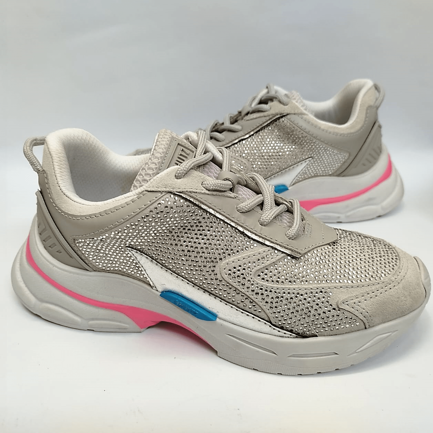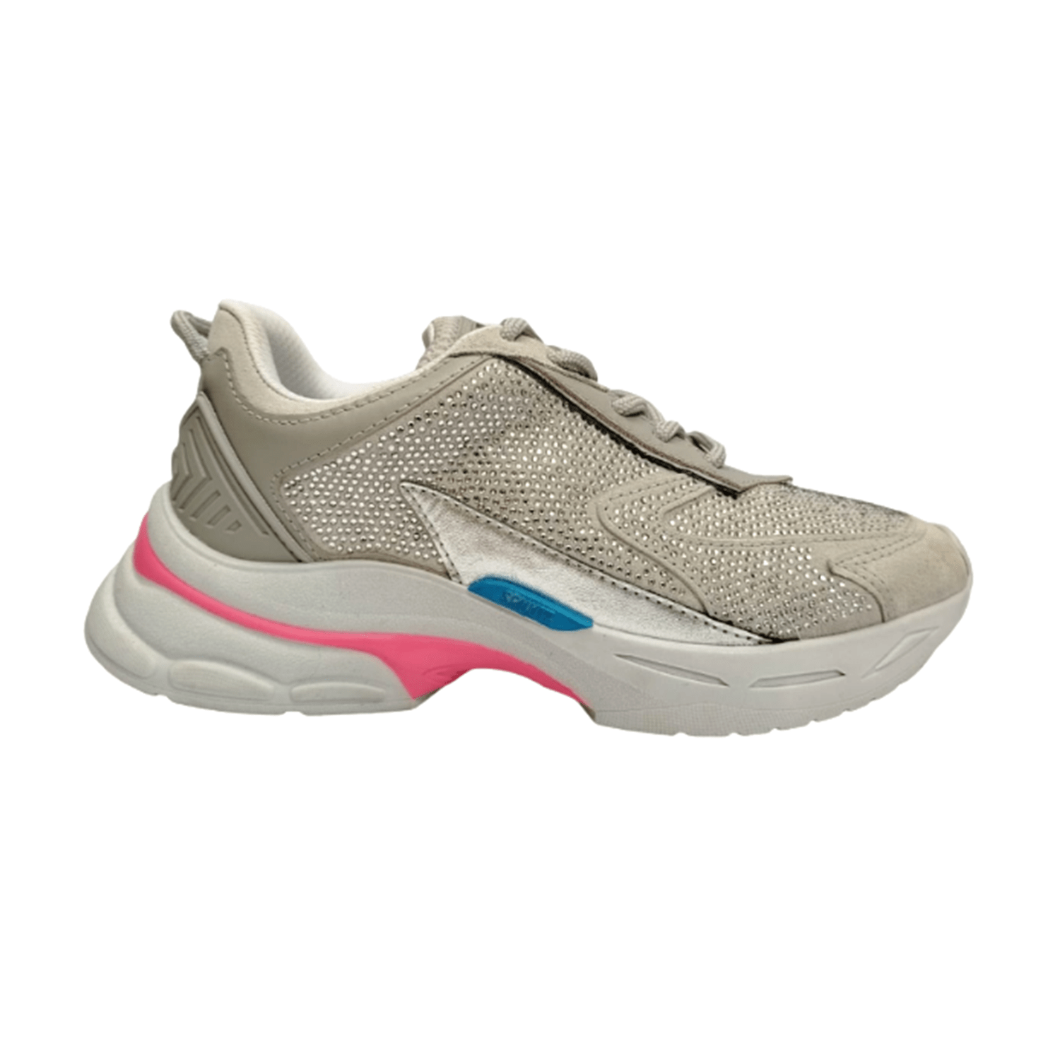 Tênis confeccionado em couro com aplicação de strass, solado chunky emborrachado, bico arredondado e cadarços coloridos.