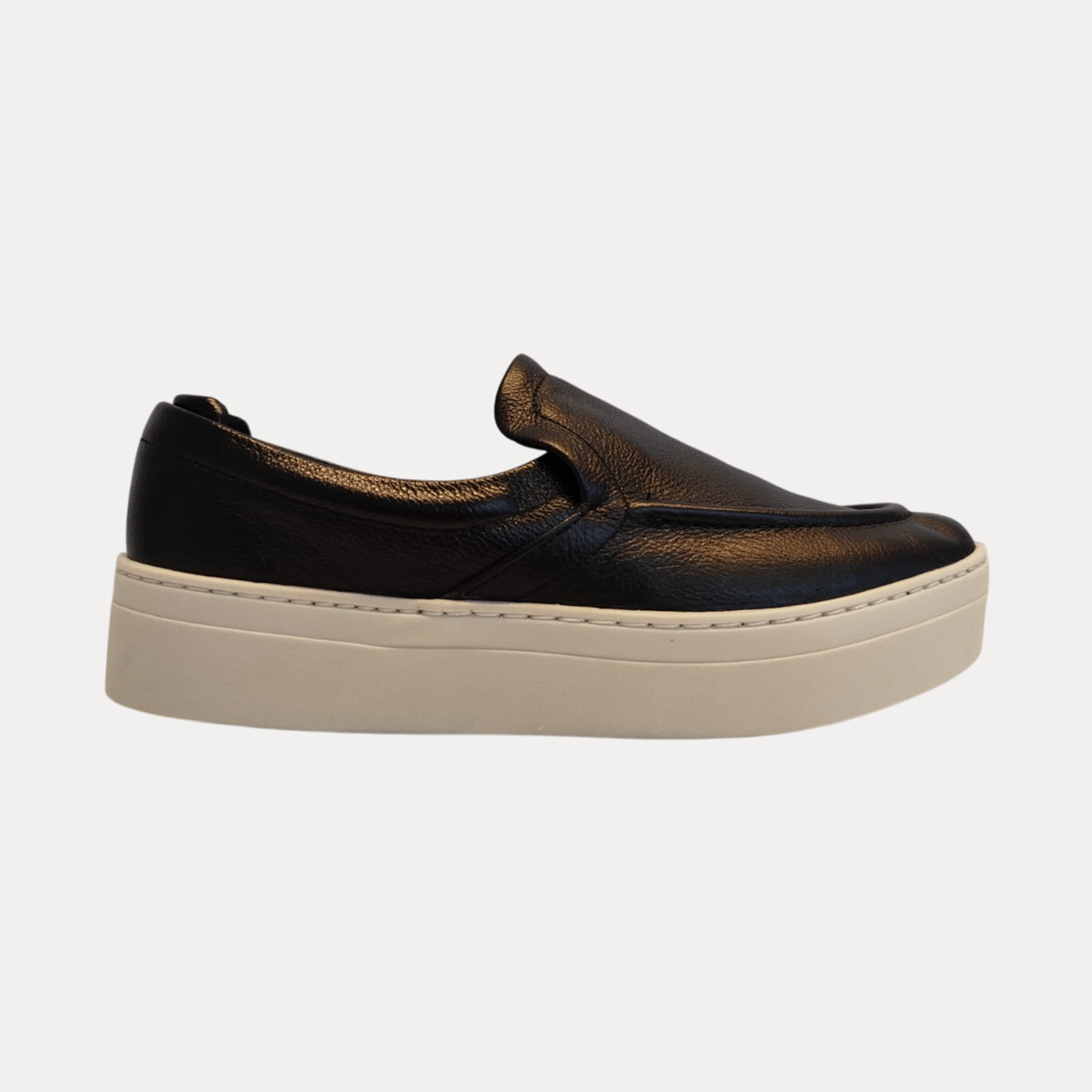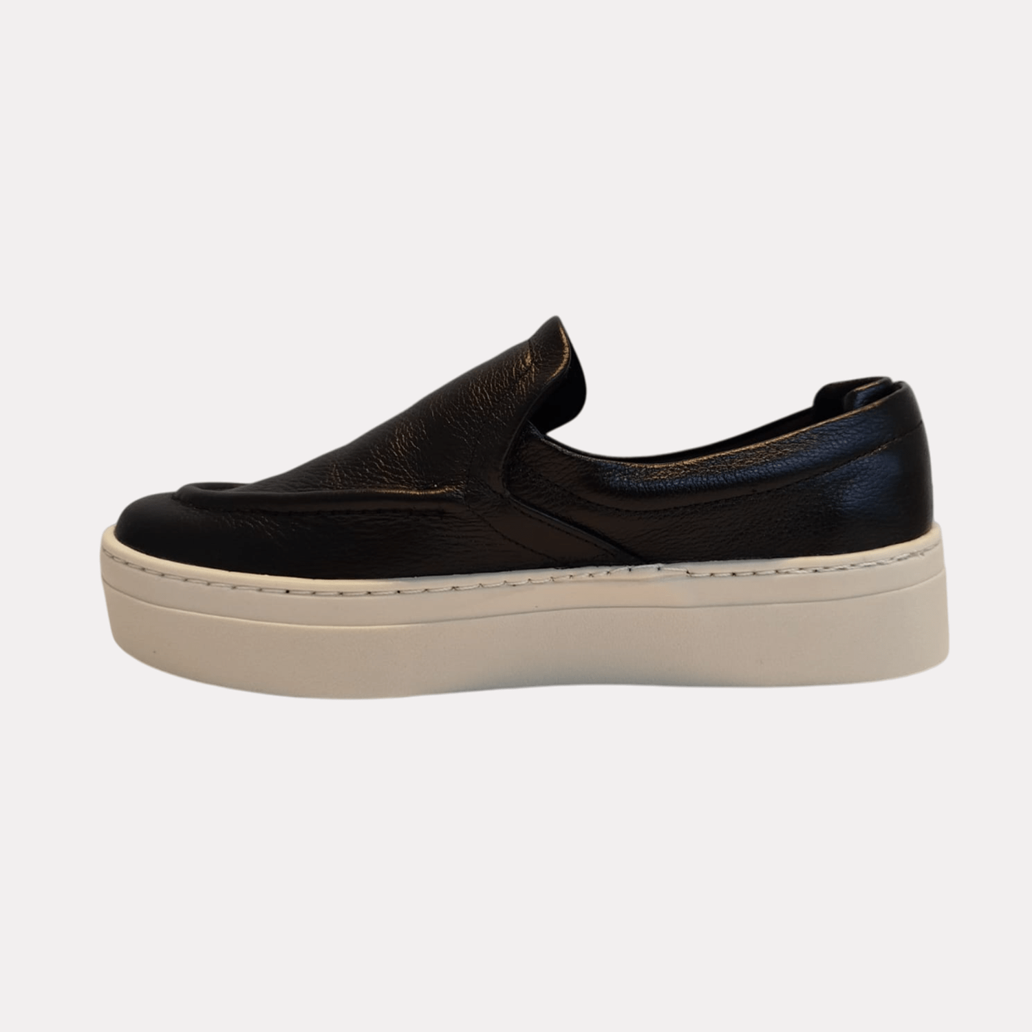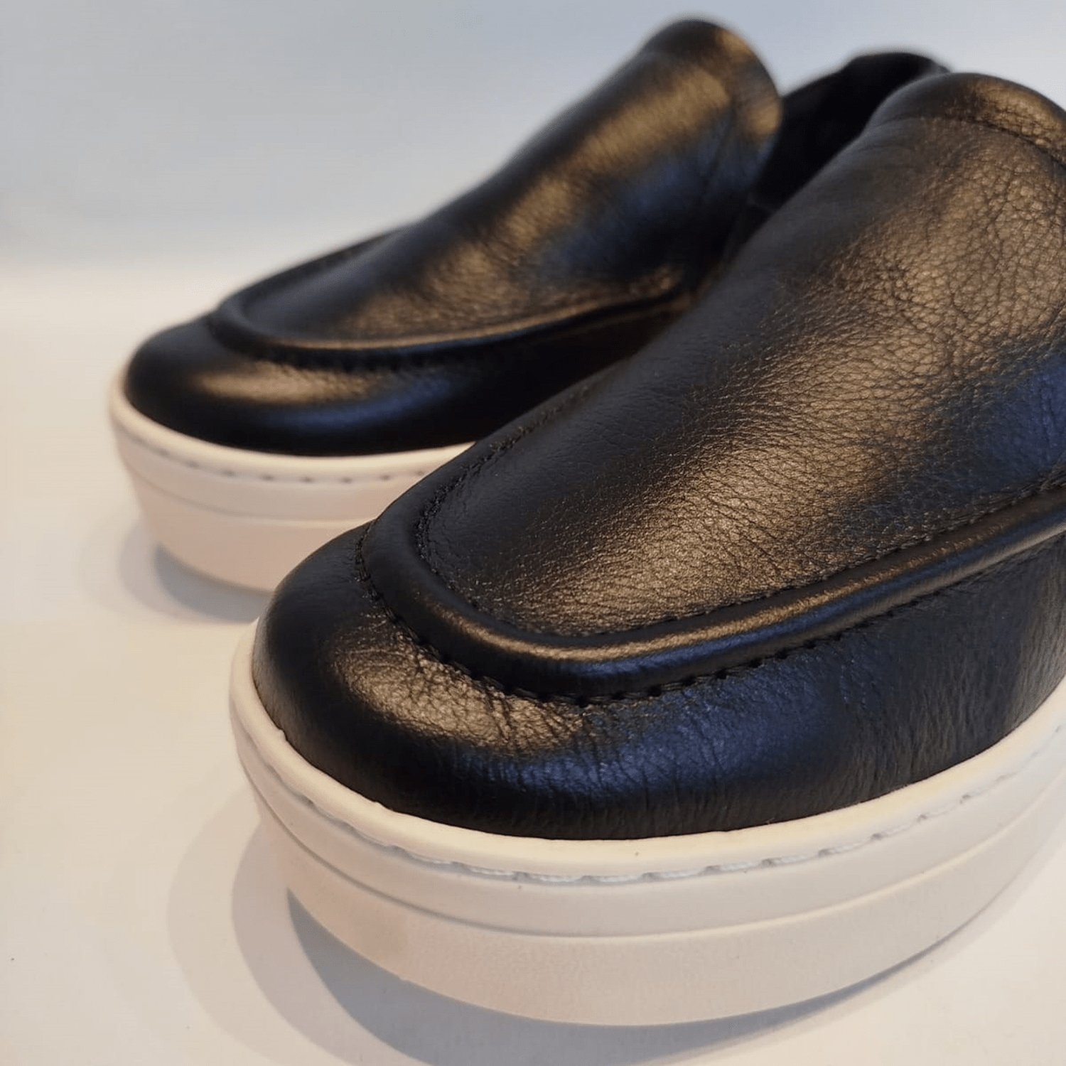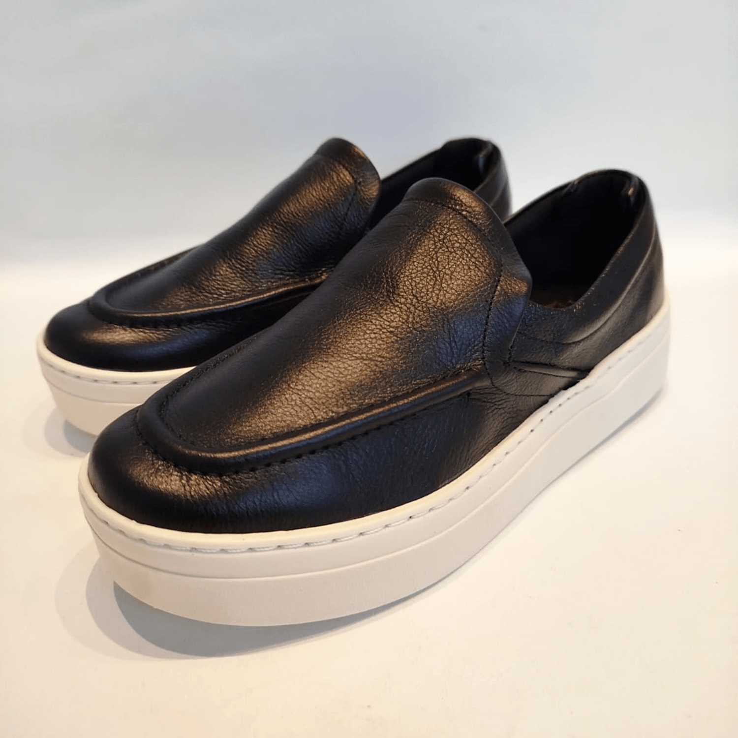 - Detalhes do modelo: Tênis feminino estilo slip-on, sem cadarços. Parte superior de couro com um detalhe de costura na parte da frente. Sola na cor branca, criando um contraste com a parte de cima do sapato. O interior do calçado tem um forro de cor clara.